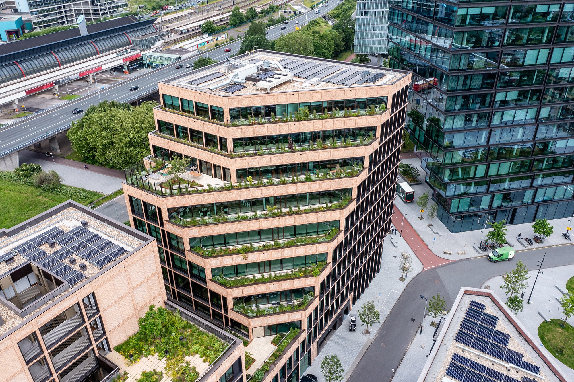Green terraces with grass, plants and flowers. High sustainability certification BREEAM-NL. Outstanding to achieve a healthy working climate.
